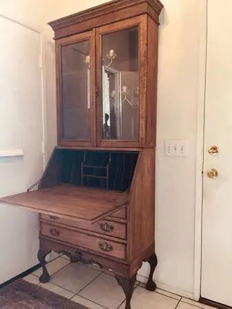 Up for sale my uncles antique Chippendale solid oak secretary desk bureau dresser buffet display organizer combo ! This lovely secretaire desk is made of solid oak wood it is in excellent condition considering its age, all the drawers slide in out easily and the drop down writing section of the desk works as it should. This solid oak desk has traditional chippendale style and design, it has a large silhouette, ball and claw feet, beautiful facade front, and comes in antique oak patina finish. This charming desk has a drop down desk writing area which works in a magically shrewd mechanical way once the drop down is let open the metal mechanism holds the drop down writing area, the inner area of the drop down is a hutch tat comes with cool pigeon holes and additional sections for organization of letters paperwork or stuff ! this secretary desk boasts with old school workmanship dovetailed drawers and antique brass hardware, the top section is a display cabinet buffet style with beveled glass fronts. By acquiring vintage items is like bringing a piece of history into your space. These heirloom pieces carry stories, craftsmanship, and unique character that new items often lack. Plus, they contribute to sustainability by reducing waste and the demand for new resources. Whether it’s vintage furniture, reclaimed wood decor, or repurposed art, these items add charm and personality to your home or office while honoring the past. Note -1- For any inquiries please text me or call me 818-809-8470. Note-2- If you see the item listed it means it’s available once sold I delete the listing immediately. We thank you sincerely for craiglisting and happy purchases to you