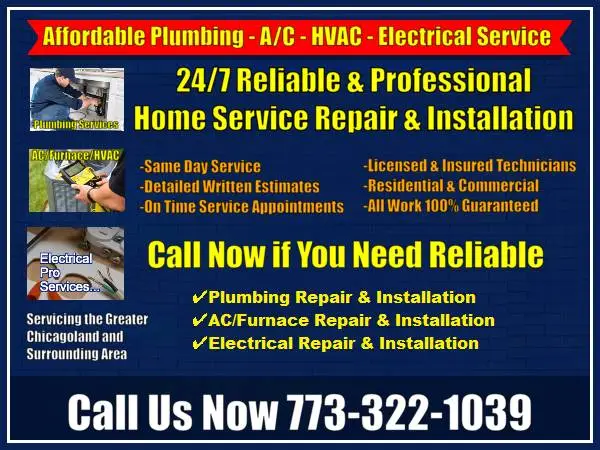 Chicago & Surrounding Affordable & Reliable Plumbing / Plumber A/C HVAC & Electrical Services You Can Trust! Are you dealing with a leaky faucet, a broken AC unit, or flickering lights? Don’t let home repairs disrupt your life. We specialize in top-quality plumbing, HVAC, and electrical services that keep your home running smoothly. Why Choose Us? Expert Technicians: Our licensed and experienced professionals are equipped to handle all your plumbing, heating, cooling, and electrical needs. 24/7 Emergency Services: Unexpected problems can happen anytime. That’s why we’re available around the clock to provide prompt and reliable service. Affordable Pricing: Quality service doesn’t have to break the bank. We offer competitive rates and transparent pricing with no hidden fees. Satisfaction Guaranteed: We stand behind our work with a 100 satisfaction guarantee. Your comfort and safety are our top priorities. Our Services Include: Plumbing: From leak repairs to water heater installations, we’ve got your plumbing covered. HVAC: Stay comfortable year-round with our expert heating and cooling services, including repairs, installations, and maintenance. Electrical: Ensure your home’s electrical systems are safe and efficient with our full range of services, from wiring to lighting. Contact Us Today! Don’t wait for a small problem to become a big headache. Call Now 773-322-1039 for an affordable Estimate. Let us help you keep your home in top condition 🔧 Professional Plumbing Services – Affordable & Reliable! Emergency Plumbing: 24/7 Service for Burst Pipes, Leaks, and Blockages Leak Detection & Repair: Fixing Leaks in Pipes, Faucets, and Fixtures Drain Cleaning: Clearing Blockages in Sinks, Toilets, and Showers Pipe Repair & Replacement: Damaged Pipes? We Repair or Replace Them Water Heater Services: Installation, Repair, and Maintenance Toilet Repair & Installation: Running or Clogged Toilet? We’ve Got You Covered Faucet & Fixture Installation/Repair: Dripping Faucets and New Installations Sewer Line Services: Inspections, Repairs, and Replacements Garbage Disposal Services: Installation and Repair Sump Pump Installation & Repair: Prevent Basement Flooding Water Filtration Systems: Installation and Maintenance Outdoor Plumbing: Faucets, Irrigation Systems, and More Gas Line Services: Installation, Leak Detection, and Repair 📞 Call us today 773-322-1039 for an estimate with Fast, Friendly, and Professional Service You Can Trust! ❄️🔥 Expert HVAC Services – Keep Your Home Comfortable Year-Round! AC Repair & Installation: Fast Repairs and New System Installations Heating System Repair & Installation: Furnaces, Boilers, Heat Pumps HVAC Maintenance: Seasonal Tune-Ups and System Inspections Duct Cleaning & Repair: Improve Air Quality and System Efficiency Thermostat Installation: Programmable and Smart Thermostats Indoor Air Quality Solutions: Air Purifiers, Humidifiers, and Ventilation Ductless Mini-Split Systems: Efficient Heating and Cooling Solutions Emergency HVAC Services: 24/7 Repairs for All Systems Heat Pump ServFurnace Cleaning & Safety Checks: Ensure Safe and Efficient Operationices: Installation, Repair, and Maintenance Air Conditioning Recharge: Restore Your AC’s Cooling Power Commercial HVAC Services: Custom Solutions for Businesses 📞 Call us now 773-322-1039 for Reliable, Affordable, and Professional HVAC Service! ⚡ Professional Electrical Services – Safe, Reliable, and Affordable! 🔌 Services Offered: Electrical Repairs: Fixing Outlets, Switches, and Wiring Issues Panel Upgrades: Upgrade Your Electrical Panel for Safety and Capacity Lighting Installation: Indoor, Outdoor, LED, and Smart Lighting Ceiling Fan Installation: Expert Installation and Wiring Rewiring Services: Whole House and Room-Specific Rewiring Circuit Breaker Replacement: Safeguard Your Home with New Breakers Outlet & Switch Installation: New Installations and Replacements EV Charger Installation: Home Electric Vehicle Charging Stations Surge Protection: Whole-House Surge Protection Systems Smoke & CO Detector Installation: Ensuring Your Home is Protected Electrical Inspections: Safety Inspections and Code Compliance Home Automation: Smart Home System Setup and Integration Generator Installation: Backup Power Solutions for Your Home Hot Tub & Pool Wiring: Safe and Reliable Electrical Work for Pools Landscape Lighting: Enhance Your Yard with Professional Lighting 📞 Call Today 773-322-1039 for an Estimate! Experienced, Licensed, and Insured Electricians Ready to Help! We Service the Entire Chicago & Surrounding Area