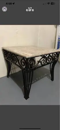 For sale a nice coffee / end table . The frame is ironmetaland the top looks like st 1 . 1 of the pictures shows the imprint on the back side which says “iron & st 1 end table”but there is no specification of what type of st 1 that is . The table is sturdy and heavy . The dimensions are as follows: table top is a 27 x 27 square and the h 8 of the table is 23. This can be seen and picked up in Rehoboth , MA , on Steber Way streetclose to Seekonk / Providence line. If interested in this table , for a faster reply send me a text to : 401-663-2075 . My name is Mike . Cash Only at the time of pick up , no m 1 y wiring . Thank you .