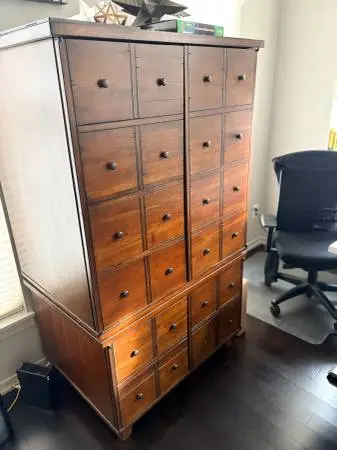 For Sale: Pottery Barn tv cabinet. Cross-posted on FB Mkt Plce Comes in 2 pieces and the shelves are adjustable. Very heavy. Dimensions: 26.6 deep 64.5 tall 37.5 wide Please text if interested: 614-738-7559