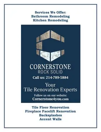 Welcome to Cornerst 1 Enterprises! You are now in contact with the highest quality Husband and Wife team duplicating customers designs exactly the way the customer pictures it and more! From custom built bench seats for showers to mosaic niches with granite shelves and edges. From custom built mud pans, moving drain if necessary! Custom built curbs and Pony walls! From installing the drain, the pan liner, sand topping, and whatever type of tile for shower floor, we have had good luck with Floor & Decor! From porcelain to ceramic tiles have been most popular! For those of you who are new to upgrading the value of your new or older home, we are here to walk you through the steps! Step 1: Call for a free home inspection of the bath or kitchen designs of your dream kitchen or bath. Step 2: Our team will listen to your ideas, and if you have pictures of what you would like, we will work with you to help make your dreams come true! Step 3: We will give you an estimate of the work to bring your dreams to reality. Step 4: Secure your time in our schedule with a security deposit. The security deposit locks you into the queue. Step 5: We arrive at designated time at your home to begin work. This is what you can expect: technicians will arrive and prep the work area. Customer participation in this is always welcome, for input for anything you wish to be protected. We will provide the tape, paper and tarps to protect the work site. Customer needs to keep in mind, who needs to take away the trash? We can remove it for a nominal fee. Or, you can save m 1 y to make arrangements to haul it away with your city. Step 6: All drain and shower or bath escutcheons will be removed. Any other plumbing or electrical needs will also be addressed. Step 7: Cut out existing drywall and tile and remove outside. We can remove cast iron tubs as well. Clean up and analyze where we are at, and secure supplies and materials that are necessary to create the foundation of your new bath. Jan will help you select your tile if you need it! This completes day 1 of the project. Day 2: Curbs to be built and mechanically fastened to the slab. With pressure-treated 2 x 4 structures, niches to be built, walls to be built, structure to be set, drain connections to be designed, and rough-in plumbing to be installed. Install liner, install Hardie Backer with Hardie Backer screws, pour sand topping concrete mix for mud pan. Apply Red Guard waterproofing sealant. Correctly slope for proper drainage. OR, set your new bathtub into the structure and connect the drain. If all goes well, we move to the next step to begin tiling by Day 3. Day 3: Custom cut and install wall tile, install tile to top and around all sides of curb. Install tile in niches. Day 4: If all goes well, install tile in mud pan. Design top of curb and knee/pony wall with granite. Day 5: Finish any other tile installation as necessary. Install granite in niches, curb and knee/pony wall. Grout walls and install grout caulk in corners as final touches. Keep in mind, 24 hours is recommended for tile to dry before grouting. And, 24 hours is also recommended for grout to dry before use. Install escutcheons for shower, faucet system, and drain. Day 6: Customer calls us and tells us how happy they are! This is the overall process for a 3 x 5 foot typical custom shower installation, including a bathtub to shower conversion. If any of the above steps are missed, the potential of your shower leaking in the future are great. Depending on the complexity of the bathroom and anything unforeseen, bathrooms usually take 7-10 days to complete. This example is noted as 5 days, if everything goes perfect. By the end of day 1, you need to lock down your tile design. Please note that we do not work on Sundays. We recommend that you add 20 more tile for waste and extra tile to keep on-hand for the future. Chris Evers 214-789-5884 Jan Evers 469-412-4142 We service all of North West Dallas down to Fort Worth. We designed Cornerst 1 around H 1 sty and Integrity, providing Dallas with over 50 Years of quality workmanship. We have found that all of our clients appreciate the fact that when we go to Home Depot or Lowes we allow our customers to pay our cost with no markup! Charging a fair labor price and offering free estimates has proven to be a successful business approach! Most repairs when d 1 correctly surpass the original installation! With years of knowledge and wisdom behind us, we have no worries of comebacks feeling secure that when we leave you will have no leaks, runs, or errors! Plumbing specialties include: 1.Kitchen and Bathroom Faucet and Drain Systems 2.Garbage Disposal replacement 3.Hot and cold input control valve replacement 4.Toilet repair and replacement 5. Water Leaks! 6.New construction stub outs 7.Kitchen and bath drain systems 8.Shower valve and tub drain repair and replacement, MOEN specialist! 9.Hot water Tank repair or replace. 10.Free Estimates! dont hesitate to call! 11.Outdoor Faucet repair and replacement. Electrical Specialties include: 1.Breaker box repair and diagnostic 2.Shorts and defective breakers 3.GFCI circuit diagnostic and repair 4.New construction wiring 5.Replacing GFCI indoor and outdoor receptacles and Diagnostic 6.Ceiling Fan Replacement 7.Lighting repair and new installation 8.New 220 amp receptacles in garages or sheds 9.If I missed anything feel free to call for a free estimate! Give Cornerst 1 a chance to show you how to save m 1 y doing things the right way! Call today 214-789-5884