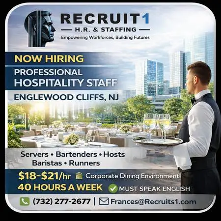 Recruit 1 is currently hiring professional hospitality staff for a corporate dining environment located in Englewood Cliffs, NJ. We are seeking experienced individuals who take pride in providing high-level service and professionalism. 🔹 Positions Available: * Servers / Waitstaff * Bartenders * Hosts / Hostesses * Baristas * Runners 💰 Pay & Schedule: - $18 – $21 per hourbased on experience - Up to 40 hours per week - Stable, consistent schedule ✅ Requirements: >Must speak conversational English >Prior hospitality experience required >Professional appearance and attitude >Experience in restaurants, hotels, banquets, or corporate dining preferred >Must be reliable and punctual 🔥 About Recruit 1: We are a professional hospitality staffing firm known for providing experienced, white-glove service staff to corporate, hospitality, and event clients. 📲 Apply Now: Call or text Fran to schedule an interview:732-277-2677 Email: ⚠️ Serious applicants only Immediate opportunities available