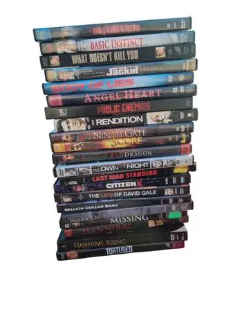 I have 21 different DVDs good titles great movies asking $15 for all. Titles : The life of David Gale, million Dollar baby, training Day, Hannibal, the missing, The 9 th gate, The score, Red dragon, we own the night, last Man standing, citizen x, tortured, Hannibal rising, along came a spider, what doesnt kill you, body of lies, Angel heart, basic instinct 2, The jackal, public enemies, and rendition Located in Omaha text 531-306-0199