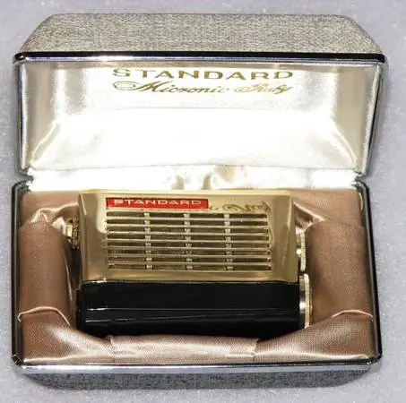 1965 TRANSISTOR STANDARD MICRONIC RUBY MINIATURE WORKING RADIO with original case, black carry strap, extra batteries, earphones, and original written material. Model #SR-H 438. 11/2 x 21/4. In the Philadelphia Museum of Art. Absolutely perfect. $95.00 cash 847-676-2088