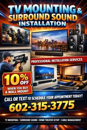 Creative Audio and Video Specialists. Need your TV mounted ? Need whole home audio? Same day / Next Day Service Audio Video Specialists A+Certified Insured Bonded Basic to Custom need help troubleshooting or installing a whole home stereo system we have you covered. Call Today 602-315-3775 Basic to Custom creative sound experts hear the difference. TV Wall Mounts for Sale – With or Without Installation! Offering professional TV wall mounting services and high-quali...
