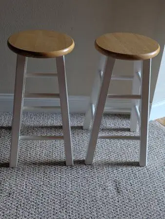 2 a pairWhite wooden backless bar stools. Counter h 823.5 Diameter 12 Excellent condition. $50 cash. 864-221-3435