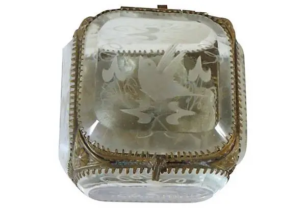 ANTIQUE FRENCH EMPIRE ORMOLO BEVELED GLASS/GILT BOX. Circa 1908. Etched bird design covers all sides. 3 long x 2.25 wide x 2.5 high. Gold metal legs, clasp, etc. Perfect. 1 Kings Lane has it reduced to $475.00. Selling for $125.00 cash. 847-676-2088