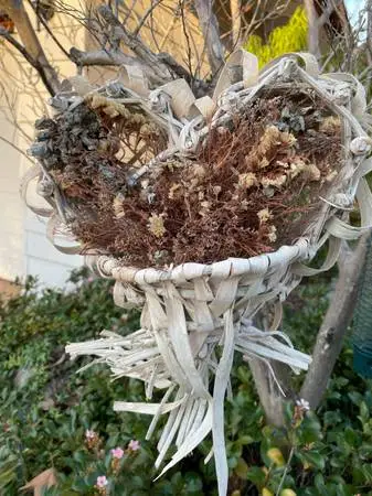 Wicker heart shaped basket with dried flowers. Could go on the wall or free hung. Flowers can definitely be replaced. Text or call No emails please 760-685-8291