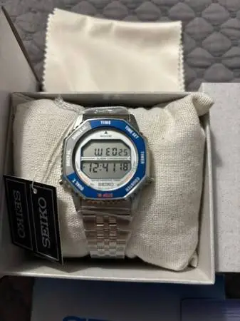 My son brought this watch back from London for me. It isn’t available in the US yet. It’s the same watch that I wore in Mission Control and many of the shuttle astronauts wore on their flights. I prefer a larger diameter now so he said I could sell it if I wanted to. It is 100% new unworn with all paperwork. Only asking for the $450 he paid not the $550 it retails for. Please message with any questions. Pickup in the Clear Lake area. Silver-tone stainless steel case and bracelet. Rotating blue and grey stainless steel bezel. Digital dial. Dial Type: digital. Seiko Caliber A824 quartz movement. Scratch resistant Hardlex crystal. Solid case back. Octagonal case shape, case size: 37 mm, case thickness: 10.6 mm. Band width: 20 mm, band length: 7.5 inches. Fold over clasp with a safety release. Water resistant at 100 meters / 330 feet. Functions: date, day, hour, minute, second, chronograph up to 100 hours in 1/100 second increments, alarm, dual-time function. Rotocall Series. Sport watch style. Seiko Rotocall Alarm Chronograph Quartz Digital Watch SMGG21P1.