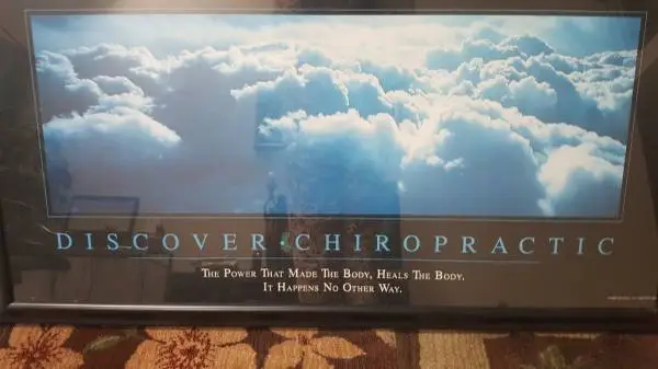 Very pretty. Great for a chiropractic office reception. It is in a black frame. It states discover chiropractic in bold blue letters and underneath.in white letters it states the power that made the body heals the body. It happens no other way. From a smoke and pet free.home. Length is 38 in and h 8 is 20 inches. I have other chiropractic tables etc if you are looking. Call 630-965-2056.