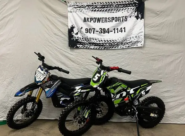 We have 36 v, 48 v, 60 v, and 72 v, electric dirtbikes in stock at Akpowersports.com in soldotna. No noise, no engine maintenance, simply turn on and go! We ship all over the state! 907-394-1141
