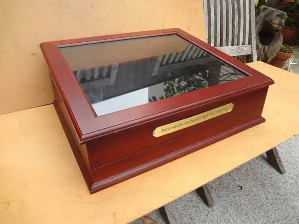 The Complete US Presidential Coins Collection Wooden Glass Display Case - MINT Condition. Dimensions are:18 x 15 x 7 If this listing is still up, the case is still available. You need not to ask me whether it is available or not. 415-531-2917