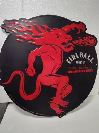 Extra large tin Fireball whiskey sign. Deep black and bright red in color. Embossed. 23 W x 22.50 H Some normal light straps here and there but not real noticeable. SEE PICS. Cash only. No emails please If interested please text or call the number listed. 321-258-3247. **SEE OTHER ADS BY THIS USER TO VIEW ADDITIONAL ITEMS FOR SALE. ** BUNDLE PRICING FOR MULTIPLE PURCHASES AT THE SAME TIME THANK YOU FOR LOOKING