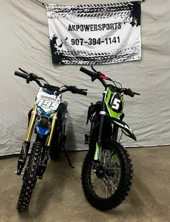 We have 36 v, 48 v, 60 v, and 72 v, electric dirtbikes in stock at Akpowersports.com in soldotna. No noise, no engine maintenance, simply turn on and go! 907-394-1141