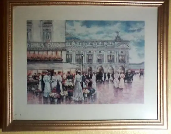 Historical Painting of Life in Paris, France, Hotel of Peace, just before WW 1 [See inscription, DE LA PAIX, on hotel]. French ladies in fine dresses shown shopping in open-air town square flower shops with horse-drawn carriages of that era in background. Signed by the great painter, Martin, and beautifully framed under glass: $80.00. [Just to frame this in gold-leaf al 1 would cost over $100.] Call: 907-444-5647