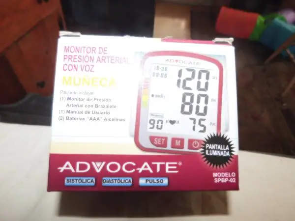 The Advocate speaking wrist blood pressure monitor accurately measures systolic and diastolic blood pressures in mmHg and heart rate in pulses/minute. Results are displayed on a large 3-color backlit LCD screen and announced in English or Spanish or they can be placed in the non-speaking mode for privacy. The cuff size range is 5.3 to 7.7. Comes in a convenient plastic carry case. Extra-large LCD for easy reading Systolic, diastolic, and pulse rate and speaks English and Spanish or silent mode W.H.O. Color-coded bp classification and backlit screen with color scale Irregular heartbeat detection with auto shut off to preserve battery life 90 memory recall, average last 3 results and optional a/c adapter