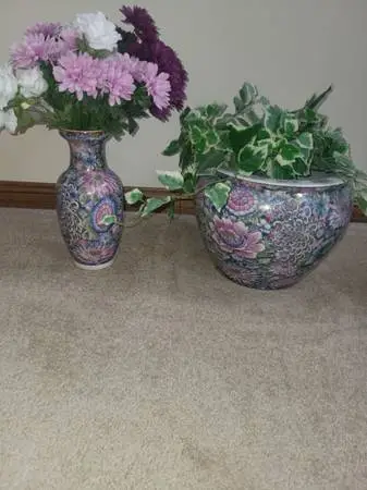 Excellent condition matching vase and plantar/urn ceramic. From a smoke and pet.free home. Does not include flowers or fake plant. Pick up at bartlett police station. Cash and carry. Call or text 630-965-2056 Approx size vase 14 in x 6 in Urn/ planter size h 812 in x width 15 in.