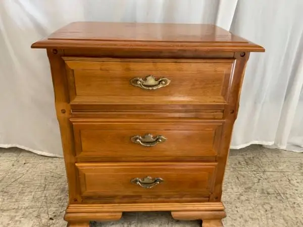 This item is a end table Golden Oak finish the dimensions on the table are 221/2 x 151/4 x 261/2. It has 3 drawers and the drawer measurements are 1578 x 121/4.. Please contact Mike for an appointment at 805-286-5466. Mmsbtz