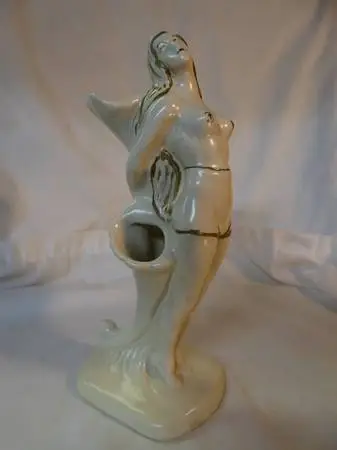 This is a 1941 Metlox Art Nouveau Romanelli Nude Vase. It is ivory in color with gold highlights in the hair and on the body. Made in USA. Design Patent 124149. It stands 9 tall. The base is 3 by 4. There is a very old pinhead size chip along the top rim of the vase. Otherwise, no cracks/chips/damage. $150. It is in Penryn. Call 916-663-2246 to see it/buy it. This item can be shipped by US Post Office. Buyer to pay actual costs of Paypal fees and mailing in addition to purchase pr...