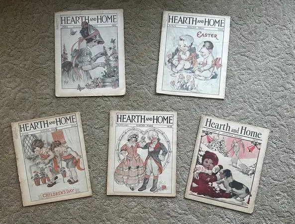 This monthly magazine, in newsprint form, offered housewives back in the day romantic short stories, articles on managing the home, songs, poems, and dress patterns—along with some interesting ads. The magazine, published by Vickey and Hill Publishing Co. of Augusta, Maine, called itself “A Journal of Choice Literature.” It measures 13 1/2 x 11 inches. Although some of the bindings have come loose, all of the magazines have the full amount of pages. One of the magazines have torn corners on the last few pages and some have a few nicks on the borders, but all of the great graphics are in good shape. Here are the dates. —July 1923 —April 1927 (loose binding0 Special Easter Edition —June 1927 (loose binding) “Children’s Day” —Feb. 1930 (good shape) —Jan. 1933 (good shape; 32 pages) New Year’s Edition Two things stand out with these magazines the cover art (most signed by F. S. Nosworthy) and the ads (some are comical). All five magazines were addressed were addressed to a person in Watervliet, MI, and are in pretty good shape for being around a hundred years old.