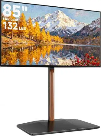 New in open box. All parts are accounted for. 【Stylish and Functional Design】The 85 inch tv stand combines premium high-density walnut-style wood with a 4x weight-tested heavy duty metal frame, easily supporting up to 132lbs. It addresses the issues of traditional Easel swivel tv stand taking up space and wood supports being too weak, transforming tight corners into stylish media spots. The thickened 5D base firmly supports your TV, eliminating wobble so you can enjoy an immersive visual experience with peace of mind. 【Universal VESA compatibility】With support for VESA sizes ranging from 100x100mm to 600x400mm, the tv stand floor fits TVs from 36 to 85. This means you can upgrade to 85, 80, 77, 65, 60, 55, 50, 43, and 40 according to your needs. The stand for tv is fully compatible with all VESA-compliant TVs, suitable for Samsung, Sony, LG, and , ensuring a perfect fit for your favorite brands! 【Enjoy a stylish entertainment corner】Adjust the height of the universal TV stand from 29 to 36.5 inches to create the ideal viewing angle for everyone. The 30-degree swivel allows you to reposition your TV effortlessly. Whether you’re hosting a game night with friends, keeping an eye on your kids while they play, or enjoying a lazy afternoon with your pet, no one misses a moment!