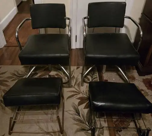Early 1960s. Both Chairs are still in good working shape. Black Fabric/Vinyl is still good and shows well. Chrome is worn in some areas and bright in others. Adjusting screw swivel works excellent. Natural canvass and hemp padding underneath fabric is still firm and in good condition. Footrests are adjustable and have 3 angled positions. Chairs at the lowered position are 32.5 inches high by 21.5 inches wide by 24 inches deep. The Footrests at lowered position are 16 inches deep by 14.5 inches wide by 13.25 inches high. If you are familiar with Florence, SC Business History, these Chairs were used in Oleens Beauty Shop in Downtown Florence and have been located in the same place for 60 plus years. Will separate as a chair and Footrest each combo. Unsure of the manufacturer. Asking $140.00 both sets obo Or $85.00 each(chair/Footrest combo) obo Located in Florence Pickup Only, Cash Transaction. Please, no Texting. Contact me either through Craigslist Email, Craigslist Chat, or Leave me a Voice-mail and Ill call you back. Im usually in Florence on Saturday and Sunday for pickup. Home Decoration Decor Hair Salon Hair Styling Tattoo Shop Parlor Piercing Antiques and Collectibles