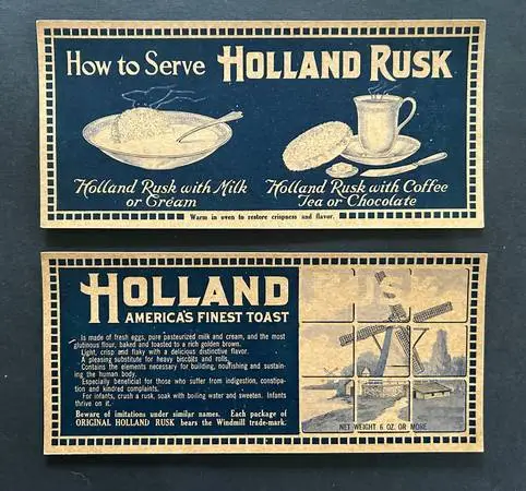 I purchased these from an estate in Holland, MI, years ago. The Holland Rusk Co. began in the late 1800s in Holland, MI. Rusk is a dry and crunchy round biscuit—basically twice-baked bread. It’s used in a lot of recipes and as a type of toast. In the Netherlands, rusk is used as a breakfast food, something like toast. It’s also used as a type of shortcake base. These two advertising blotters were put out as a promotional item for the company. They were obviously never used based on their condition. The blotters measure 8 1/4 x 3 3/4 inches and are made of a light cardboard. We could arrange shipping if preferable.