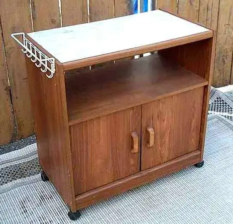 Microwave cart on wheels. Wood grain panels. Side hangers for towels and utensils. Also good as a TV stand. Middle shelf for devices such as gaming consoles. 2 bottom hinged doors that open up for even more storage. Measures 281/4 length x 153/4 deep x 29 h 8. Pick up from North Aurora, Illinois. Cash only. Please call or text 630-977-3882. If you email, please include a number I can reach you at. Thanks for looking.