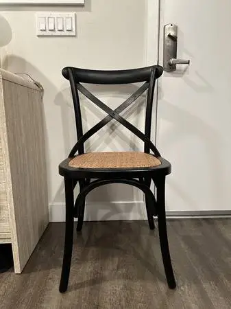 Hi everyone, Im selling a brand new, french-bistro style dining chair that can also be used as an accent chair next to a credenza or a console table. Black solid-wood frame with dense-rattan weave seating. Dimensions: 34.5 H x 19.5 W x 21 D Local pick up in Hollywood. Please text or call if interested, thanks yall! Jeff