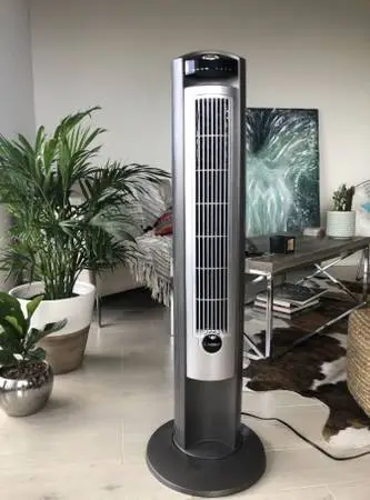Lasko 42 Wind Curve Tower Fan with Ionizer, 2551, Silver Text me please This 42 Wind Curve® Fan with a Fresh Air Ionizer option has a high reaching tower fan design for maximum air delivery. Beautifully designed with refined metallic accents and a sophisticated Wind Curve® profile, this space-saver will bring cooling comfort to any space in the home. Featuring 3 quiet speeds and widespread oscillation, this electric fan allows you to truly customize the airflow in your space. Set the auto-off timer function to have your fan run for a selected period of time, from 30 minutes to 7.5 hours, then turn off automatically. The fresh air ionizer option adds millions of negative ions to the air, creating a fresh air feeling like the great outdoors. Plus, the convenient, multi-function remote controls it all -- the power, oscillation, fan speed, timer, and ionization, so you can relax and enjoy the breeze