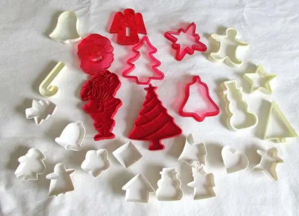25 vintage plastic cookie cutters, including: Trees, Santa, bells, snowman, angels, Ginger Bread Man, stars, candy cane, heart Durable plastic, very good condition. Call or text if interested. (4 zero 6) two 3 nine, 8 five 4 zero