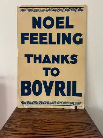 Australians love their Vegemite; the Brits lover their Marmite; Americans love their peanut butter. Back in the day, the Brits also had a meat-based spread called Bovril. In the 1870s, a Scottish butcher created a thick and salty meat paste. He originally called it “Johnston’s Fluid Beef”. I can see why it was renamed Bovril. In the late 1800s and very early 1900s, Bovril was considered a superfood. It kept a long time and had a lot of protein. During World War I, Bovril was known as the “war food.” Sometimes it was mixed with hot water to make a warm, protein-packed drink. This sign, I believe, is from the WW I era. It reads “Noel Feeling Thanks to Bovril.” “Noel” is the French way of saying “Merry Christmas.” Based on the message and the holly bordering the upper and lower part of the poster, this was an advertising poster to connect Bovril with improving the Christmas spirit. The poster is quite large, approximately 30 x 20 inches. The bottom edge is a bit rough, with a small chunk missing on the lower right part of the poster. Also, one of the middle seams has split slightly. Because the poster is so old, a previous owner affixed it to a piece of cardboard for more support to preserve it. Regardless, it’s a great advertising poster from the early 1900s.