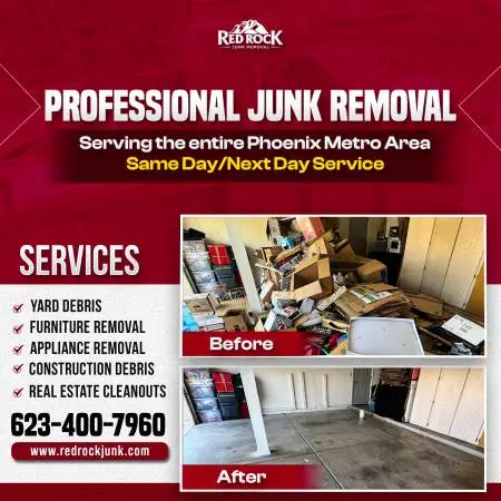 We are the professional junk removal company that Arizonans call for their junk removal needs. Our company is proud to be helping our customers from the smallest jobs such as single item pick up all the way to our commercial experience of demo and full property clean out! We pride our self in our ability to be efficient and deliver on time. ♻️ We Get Junk, Debris, and Large Items Out! ANY Type Of Junk ♻️ – Residential & Commercial Junk Removal – Commercial Property Clean Out – Furniture Removal – Television Disposal – Yard Waste Removal – Foreclosure Clean Outs – Appliance Removal – Hot Tub Removal – Trash Removal – Mattress Disposal – Refrigerator Disposal – Construction Waste Removal – Garbage Removal + Much More! 📲 Call or Text 623-400-7960 📲 Crew Can Be On-Site Today - We’ll Haul Away ANY Kind Of Junk! No Job is Too Big or Too Small. If You Have Junk, We Can Remove It. Red Rock Junk Removal is a full service junk removal and recycling company providing professional, efficient, and dependable removal of unwanted items, trash, or junk from residential or commercial properties. Our team of uniformed junk removal experts is capable of handling projects of all sizes, whether it’s a small item pickup or a complete property clean-out. As a locally owned company, we are dedicated to serving our community year-round so call us anytime! – Free Estimates – Affordable Pricing – Same Day Junk Removal Available – Licensed and Insured 📲 Call or Text 623-400-7960 📲 Hours of Operation: Monday – Sunday: 6:00 a.m. – 9:00 p.m. Service Areas: Phoenix, Mesa, Queen Creek, San Tan Valley, Florence, Chandler, Gilbert and all surrounding areas. 🚛 Ready to Take Care Of Your Junk Problem? Call or Text 623-400-7960 🚛 »»»KEY WORDS PLEASE IGNORE»»» Junk Removal, Throwaway Trash, Throw away Trash, Jacuzzi removal, Jacuzzi Hauling, Jacuzzi Pick Up, Jacuzzi PickUp, Jacuzzi trash out, Sofa Disposal, Sofa Pickup, Sofa Pick Up, Junk Services, Junk Service, Trash Pickup, Trash Pick up, Trash King, Hoarder cleanout, Hoarder clean out, Hoarder cleaning, Hoarder Job, Hoarder cleaning service, Hoarder cleanup, Hoarder clean up, Hoarder house cleanup, Hoarder house clean up, Hoarding pros, Hoarding cleanup, Hoarding clean up, Estate sale cleanup, Estate sale clean up, Estate sale Pickup, Estate sale Pick up, Estate Sale cleaning service, Estate Sale Pros, Estate Sale Cleaning, Estate Sale Job, Estate cleanout, Estate clean out, Property Cleanout, Property Clean out, Property cleaning service, Property trash Pickup, Property trash Pickup, Storage Cleanup, Storage Clean Up, Storage Pickup, Storage Pick Up, Storage unit Clean Up, Storage Unit Cleanup, Foreclosure Cleanup, Foreclosure Cleanup, Foreclosure Trash pick up, Foreclosure Trash Pickup, Eviction Clean up, Eviction Cleanup, Eviction Trash Pickup, Eviction Trash pick up, Yard Cleanups, Yard Clean up, Barn Clean out, Barn Cleanout, Barn Cleanup, Barn Clean up, Barn Trash out, Barn Trashout, Attic cleanout, Attic Clean out, Attic Trash out, Attic Trashout, Basement Cleanout, Basement Clean out, Basement Cleanup, Basement Clean up, Construction Debris, Furniture Removal, Appliance Removal, Bulk Trash Removal, Brush and Tree Limb Debris Removal, Garbage Removal, Trash Removal, Junk Removal, Remodeling Debris Clean up, Warehouse Clean out, Warehouse Cleanout, Storage Unit Clean out, Storage Unit Cleanout, Garage Clean out, Garage Cleanout, Shed Clean out, Shed Cleanout, Garage Sale clean up, Garage Sale cleanup, Garage Trash out, Garage Trashout, Yard Sale leftovers, Rental Home Clean out, Rental Home Cleanup, Rental Home Clean up, Apartment Clean out, Apartment Cleanup, Apartment Clean up, Foreclosure, Eviction Clean out, Move-Out Services, Hoarding Clean outs, Light Demolition, Wood and Tree Branch Cleanups, Yard Cleanups, Dumping Services, Trash Haul off, Hot Shots, Mobile Home - Trailer Demolition, Delivery Services, Curbside pick up, Curbside pickup, Couches Pickup, Couch Pickup, Sofas Pickup, Sofa Pickup, Sofa Pick up, Loveseats Pickup, Furniture trash out, Furniture trash out, Appliances Pickup, Appliance Trash out, Appliance Trashout, Scrap metal Pickup, Scrap Metal Pick up, Refrigerators Pickup, Refrigerator Pick up, Freezer Pickup, Freezer Pick up, Stoves Pickup, Stove Pick Up, Stove Pickup, Stove Trashout, Washer Pickup, Washer Pick Up, Dryer Pick Up, Dryer pickup, Treadmill Pickup, Treadmill Pick Up, Treadmill Trash out, Treadmill Trashout, Office chairs Pickup, Office Chair Pick Up, Tables Pickup, Table Pick up, Table Trashout, Table out, Junk Removal, junk pickup, trash removal, trash hauling, office cleanout, warehouse cleanout, house cleanout, garage cleanout, building cleanout, REI trashout, foreclosure cleanout, rental property cleanout, eviction cleanout, mattress removal, couch removal, sofa removal, loveseat removal, sectional removal, box removal, furniture removal, desk removal, garbage removal, appliance removal, dishwasher removal, refrigerator removal, stove removal, washer removal, dryer removal, appliance pickup, appliance disposal, hot tub removal, hot tub disposal, deck removal, shed removal, yard debris removal, brush removal, leaf removal, leaf bag pickup, raking, leaf blowing. Junk Removal, junk pickup, trash removal, trash hauling, office cleanout, warehouse cleanout, house cleanout, garage cleanout, building cleanout, trashout, foreclosure cleanout, rental property cleanout, eviction cleanout, mattress removal, couch removal, sofa removal, loveseat removal, sectional removal, box removal, furniture removal, desk removal, garbage removal, appliance removal, dishwasher removal, refrigerator, Homeservices Phoenix Glendale Avondale Goodyear Laveen Mesa Scottsdale Tempe Peoria Apache Junction Queen Creek San Tan Valley New River Sun City Surprise Ahwatukee Fountain Hills Gold Canyon Carefree Paradise Valley Deer Valley Happy Valley Gilbert Desert Ridge Anthem Litchfield Bucke