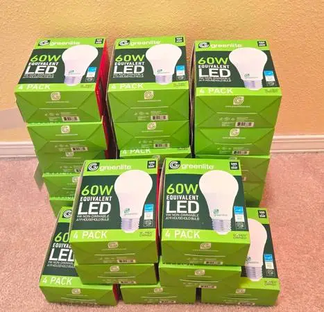 Hello! For sale are 88 Greenlite LED Light Bulbs 60 W Equivalent. There are 22 boxes, each with 4 bulbs. They are all brand new. Non-Dimmable. Only asking $65 for the entire lot. If interested, please text Jeremy at 720-530-3704. Thank you!